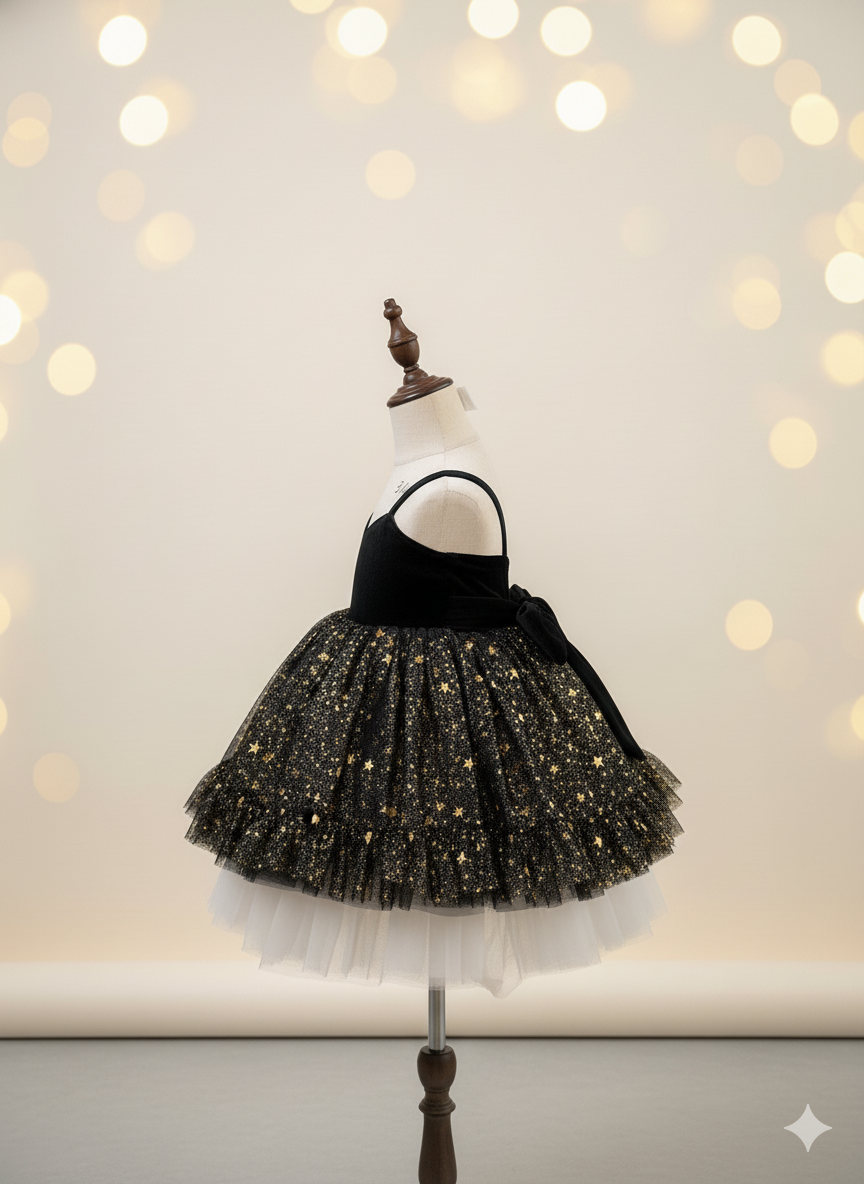 Finished with a grand velvet bow at the back, this dress captures the glow of a starlit night — ideal for New Year’s celebrations, festive portraits, and magical moments under the lights.